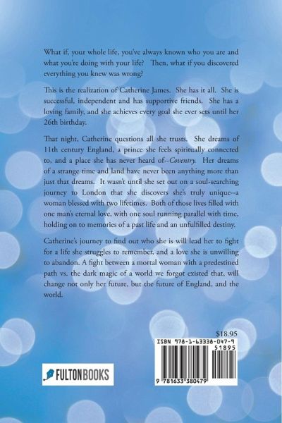 What if, your whole life, you've always known who you are and what you're doing with your life? Then, what if you discovered everything you knew was wrong? This is the realization of Catherine James. She has it all. She is successful, independent and has supportive friends. She has a loving family, and she achieves every goal she ever sets until her 26th birthday. That night, Catherine questions all she trusts. She dreams of 11th century England, a prince she feels spiritually connected to, and a place she has never heard of--Coventry. Her dreams of a strange time and land have never been anything more than just that dreams. It wasn't until she set out on a soul-searching journey to London that she discovers she's truly unique--a woman blessed with two lifetimes. Both of those lives filled with one man's eternal love, with one soul running parallel with time, holding on to memories of a past life and an unfulfilled destiny. Catherine's journey to find out who she is will lead her to fight for a life she struggles to remember, and a love she is unwilling to abandon. A fight between a mortal woman with a predestined path vs. the dark magic of a world we forgot existed that, will change not only her future, but the future of England, and the world.