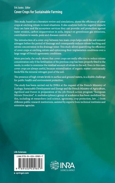 This study, based on a literature review and simulations, shows the efficiency of cover crops at catching nitrate in most agriculture situations. It also analyzes both the negative impacts they can have and the ecosystem services they can provide. The introduction of a cover crop between two main crops helps catch the soil mineral nitrogen before the period of drainage and consequently reduces nitrate leaching and nitrate concentration in the drainage water. This study allows quantifying the efficiency of cover crops at catching nitrate and optimizing their implantation conditions over a large range of French pedoclimatic conditions. The presence of high nitrate levels in surface and ground waters, due to excessive nitrogen fertilization and natural production of nitrate by soil organic matter mineralization, is a double challenge for public health and environment protection.