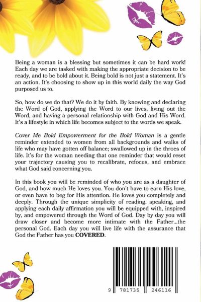 "Cover Me Bold: Empowerment for the Bold Woman" is a gentle reminder to women from all backgrounds and walks of life who may have lost their balance, overwhelmed by life's challenges, and are in need of that one reminder to help them recalibrate, refocus, and embrace what God has said about them. In this book every woman will be reminded of her identity as a daughter of God, and how much He loves, adores, and affirms you as such. You don't have to earn God's love or beg for His attention; He loves you completely and deeply. Through the simplicity of reading, speaking, and applying each daily affirmation; you will be equipped with the Word of God. You will be inspired and empowered by the promises of God, and day by day you will be affirmed and filled by the Word of the Father, the personal God. Sweeping you into the full assurance that God the Father has you boldly COVERED.