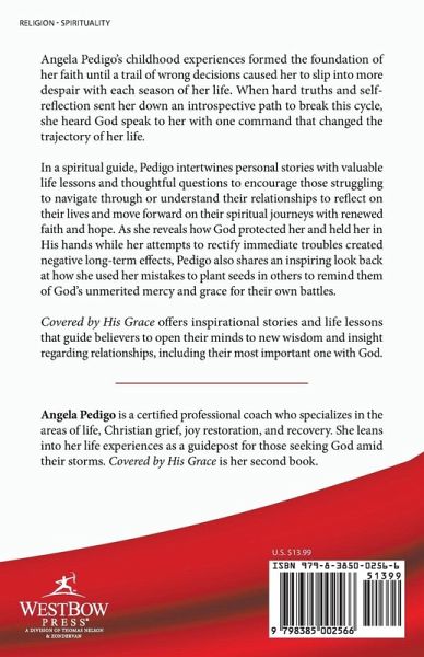 Angela Pedigo's childhood experiences formed the foundation of her faith until a trail of wrong decisions caused her to slip into more despair with each season of her life. When hard truths and self-reflection sent her down an introspective path to break this cycle, she heard God speak to her with one command that changed the trajectory of her life. In a spiritual guide, Pedigo intertwines personal stories with valuable life lessons and thoughtful questions to encourage those struggling to navigate through or understand their relationships to reflect on their lives and move forward on their spiritual journeys with renewed faith and hope. As she reveals how God protected her and held her in His hands while her attempts to rectify immediate troubles created negative long-term effects, Pedigo also shares an inspiring look back at how she used her mistakes to plant seeds in others to remind them of God's unmerited mercy and grace for their own battles. Covered by His Grace offers inspirational stories and life lessons that guide believers to open their minds to new wisdom and insight regarding relationships, including their most important one with God.
