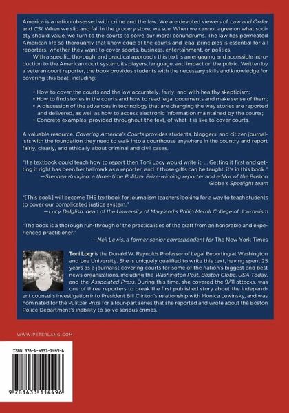 «Toni Locy is one of the nation's most gifted, tenacious court reporters. Her ability to track down records, persuade court clerks to release information, cultivate sources, and make a very complicated justice system comprehensible to the public is unrivaled. Her textbook will prepare young journalists to follow in her footsteps. It has a logical format, explains court procedures in plain English, and uses fascinating examples from her own career to illustrate various reporting principles. It will become THE textbook for journalism teachers looking for a way to teach students to cover our complicated justice system.» (Lucy Dalglish, dean of the University of Maryland's, Philip Merrill College of Journalism)