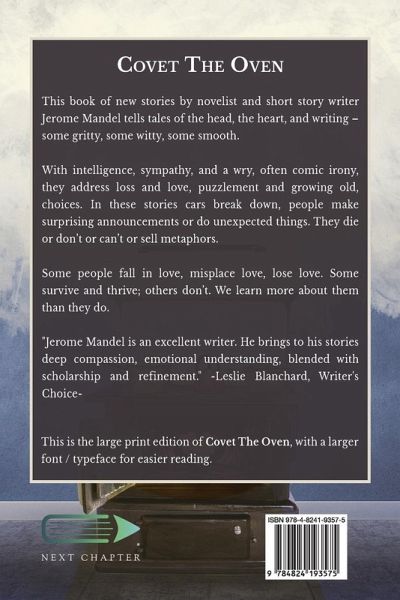 This book of new stories by novelist and short story writer Jerome Mandel tells tales of the head, the heart, and writing - some gritty, some witty, some smooth. With intelligence, sympathy, and a wry, often comic irony, they address loss and love, puzzlement and growing old, choices. In these stories cars break down, people make surprising announcements or do unexpected things. They die or don't or can't or sell metaphors. Some people fall in love, misplace love, lose love. Some survive and thrive; others don't. We learn more about them than they do. "Jerome Mandel is an excellent writer. He brings to his stories deep compassion, emotional understanding, blended with scholarship and refinement." -Leslie Blanchard, Writer's Choice- This is the large print edition of Covet The Oven, with a larger font / typeface for easier reading.