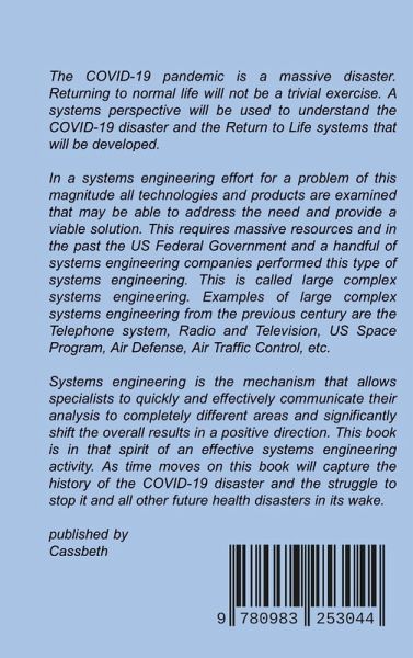 The COVID-19 pandemic is a massive disaster. Returning to normal life will not be a trivial exercise. A systems perspective will be used to understand the COVID-19 disaster and the Return to Life systems that will be developed. In a systems engineering effort for a problem of this magnitude all technologies and products are examined that may be able to address the need and provide a viable solution. This requires massive resources and in the past the US Federal Government and a handful of systems engineering companies performed this type of systems engineering. This is called large complex systems engineering. Examples of large complex systems engineering from the previous century are the Telephone system, Radio and Television, US Space Program, Air Defense, Air Traffic Control, etc. Systems engineering is the mechanism that allows specialists to quickly and effectively communicate their analysis to completely different areas and significantly shift the overall results in a positive direction. This book is in that spirit of an effective systems engineering activity. As time moves on this book will capture the history of the COVID-19 disaster and the struggle to stop it and all other future health disasters in its wake.