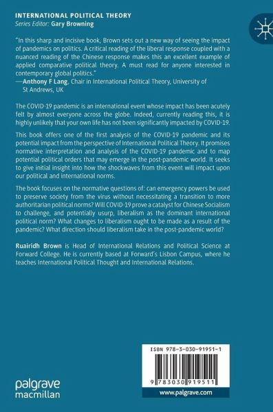 This book offers one of the first analysis of the COVID-19 pandemic and its potential impact from the perspective of International Political Theory. It promises normative interpretation and analysis of the COVID-19 pandemic and to map potential political orders that may emerge in the post-pandemic world. It seeks to give initial insight into how the shockwaves from this event will impact upon our political and international norms.