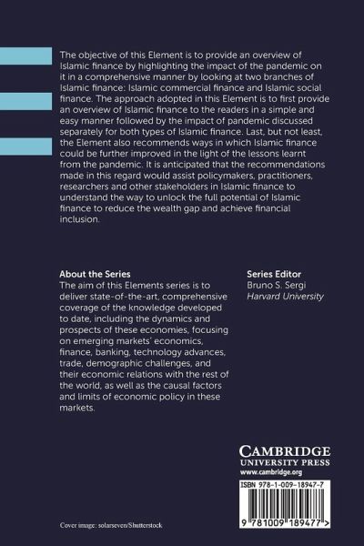 The objective of this Element is to provide an overview of Islamic finance by highlighting the impact of the pandemic on it in a comprehensive manner by looking at two branches of Islamic finance: Islamic commercial finance; and Islamic social finance.