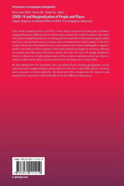 Chapter 1. Introduction(Borna Fuerst-Bjelis, Etienne Nel and Stanko Pelc).- Part I: COVID's Global Impact and Marginalisation.- Chapter 2. COVID-19s Economic and Social Impact Globally(Borna Fuerst-Bjelis, Etienne Nel and Stanko Pelc).- Part II: Social Impacts and Marginalisation.- Chapter 3. De-Marginalising Social-Democracy: The Recovery Of The Collectivity In Europe During Covid-19 Pandemic(Hugo Capellà i Miternique).- Chapter 4. COVID-19 Lockdown and Education: The Risk of Increasing Marginalisation - Distance-Education in Switzerland During the Spring 2020 Lockdown(Walter Leimgruber).- Chapter 5. Restrictions on Formal Education Due to the COVID-19 Pandemic and Their Effects on Growing Marginalisation in Argentina(Margarita Schmidt and Claudio Urra Coletti).- Chapter 6. Addressing Geographical Marginality During the COVID-19 Pandemic in Romania: Civil Society, Volunteerism, and Networking(Oana-Ramona Ilovan, Alexandra Ioana Ciupe and Csaba Horváth).- Chapter 7. The COVID-19 pandemic in Malaysia: Its impacts on the poor and migrant workers communities in urban areas.(Jamalunlaili Abdullah and Marlyana Azyyati Marzukhi).- Chapter 8. Marginality and Resilience Strategies in Coastal Fishing Villages during the COVID-19 Pandemic in the State of Yucatan, Mexico(José Manuel Crespo-Guerrero and Araceli Jiménez-Pelcastre).- Part III: Economic Impacts and Marginalisation.- Chapter 9. The COVID-19 pandemic and the enhanced marginalisation of marginal tourist destinations(Gabriel Camara).- Chapter 10. Exacerbating Marginalisation: COVID-19's Impact on Peripheral, Tourism-Dependent Regions in New Zealand and Local Responses(Etienne Nel).- Chapter 11. The COVID-19 pandemic's implications for tourism preferences in Croatia: potential new challenges for marginal areas(Borna Fuerst-Bjelis and Ivan Sulc).- Chapter 12. The Impact of COVID-19 Pandemic on Tourism in Romania in 2020 With Special Regard on Marginal Rural Areas(Raularian Rusu).- Chapter 13. Tourism and (De)Marginalisation: How to Minimise the Cost of COVID-19 in Porto(Ana Ferreira).- Part IV: COVID-19's Impact on Movement and Globalisation.- Chapter 14. Spatial Diffusion of COVID-19: From Hyper-Connected Territories to Marginal Areas: the Case of Niassa, Mozambique(Paulo Nossa, Anabela Mota-Pinto, Alice Freia, Julio Masquete, Pedro Bem-Haja Fernanda Cravidão).- Chapter 15. Vietnam's Global Market Integration During the Covidian Era : An Exploratory Analysis of the Pandemic's Marginalising Effects on the Rural Poor(Antoine Beaulieu).- Part V: Conclusion.- Chapter 16. Some Conclusions About COVID-19's Impact on Marginality and Marginalisation(Borna Fuerst-Bjelis, Etienne Nel and Stanko Pelc).