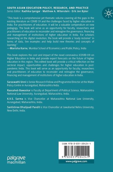 This book explores the cost and impact of the novel coronavirus (COVID-19) on Higher Education in India and provide expert forecasts on the future of higher education in this region. This edited book will provide a critical reflection on the sectoral impact, opportunities and challenges for higher education in post-pandemic India. This book will serve as an opportunity for faculty, researchers and practitioners of education to reconsider and reimagine the governance, financing and management of institutions of higher education in India.
