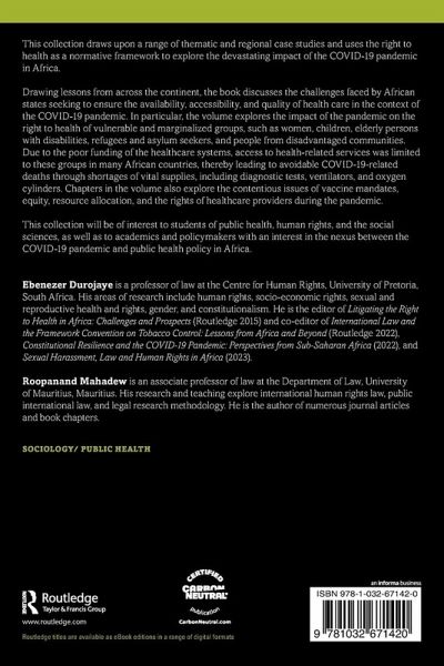 Drawing lessons from across the continent, the book discusses the challenges faced by African states seeking to ensure the availability, accessibility, and quality of health care in the context of the COVID-19 pandemic. In particular, the volume explores the impact of the pandemic on the right to health of vulnerable and marginalized groups, such as women, children, elderly persons with disabilities, refugees and asylum seekers, and people from disadvantaged communities. Due to the poor funding of the healthcare systems, access to health-related services was limited to these groups in many African countries, thereby leading to avoidable COVID-19-related deaths through shortages of vital supplies, including diagnostic tests, ventilators, and oxygen cylinders. Chapters in the volume also explore the contentious issues of vaccine mandates, equity, resource allocation, and the rights of healthcare providers during the pandemic.