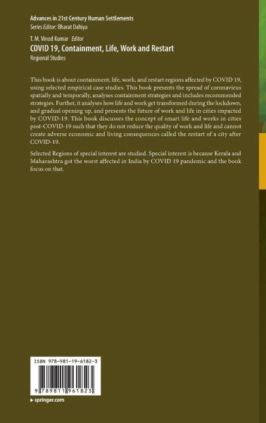 This book is about containment, life, work, and restart regions affected by COVID 19, using selected empirical case studies. This book presents the spread of coronavirus spatially and temporally, analyses containment strategies and includes recommended strategies. Further, it analyses how life and work get transformed during the lockdown, and gradual opening up, and presents the future of work and life in cities impacted by COVID-19. This book discusses the concept of smart life and works in cities post-COVID-19 such that they do not reduce the quality of work and life and cannot create adverse economic and living consequences called the restart of a city after COVID-19. Selected Regions of special interest are studied. Special interest is because Kerala and Maharashtra got the worst affected in India by COVID 19 pandemic and the book focus on that.