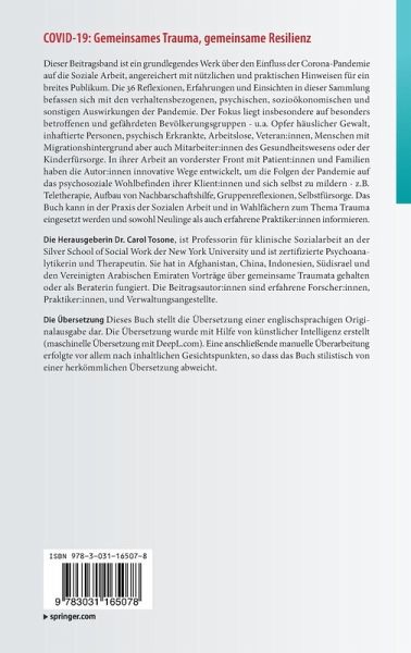 Dieser Beitragsband ist ein grundlegendes Werk über den Einfluss der Corona-Pandemie auf die Soziale Arbeit, angereichert mit nützlichen und praktischen Hinweisen für ein breites Publikum. Die 36 Reflexionen, Erfahrungen und Einsichten in dieser Sammlung befassen sich mit den verhaltensbezogenen, psychischen, sozioökonomischen und sonstigen Auswirkungen der Pandemie. Der Fokus liegt insbesondere auf besonders betroffenen und gefährdeten Bevölkerungsgruppen - u.a. Opfer häuslicher Gewalt, inhaftierte Personen, psychisch Erkrankte, Arbeitslose, Veteran:innen, Menschen mit Migrationshintergrund aber auch Mitarbeiter:innen des Gesundheitswesens oder der Kinderfürsorge. In ihrer Arbeit an vorderster Front mit Patient:innen und Familien haben die Autor:innen innovative Wege entwickelt, um die Folgen der Pandemie auf das psychosoziale Wohlbefinden ihrer Klient:innen und sich selbst zu mildern - z.B. Teletherapie, Aufbau von Nachbarschaftshilfe, Gruppenreflexionen, Selbstfürsorge. Das Buch kann in der Praxis der Sozialen Arbeit und in Wahlfächern zum Thema Trauma eingesetzt werden und sowohl Neulinge als auch erfahrene Praktiker:innen informieren. Die Herausgeberin Dr. Carol Tosone, ist Professorin für klinische Sozialarbeit an der Silver School of Social Work der New York University und ist zertifizierte Psychoanalytikerin und Therapeutin. Sie hat in Afghanistan, China, Indonesien, Südisrael und den Vereinigten Arabischen Emiraten Vorträge über gemeinsame Traumata gehalten oder als Beraterin fungiert. Die Beitragsautor:innen sind erfahrene Forscher:innen, Praktiker:innen, und Verwaltungsangestellte. Die Übersetzung Dieses Buch stellt die Übersetzung einer englischsprachigen Originalausgabe dar. Die Übersetzung wurde mit Hilfe von künstlicher Intelligenz erstellt (maschinelle Übersetzung mit DeepL.com). Eine anschließende manuelle Überarbeitung erfolgte vor allem nach inhaltlichen Gesichtspunkten, so dass das Buch stilistisch von einer herkömmlichen Übersetzung abweicht.