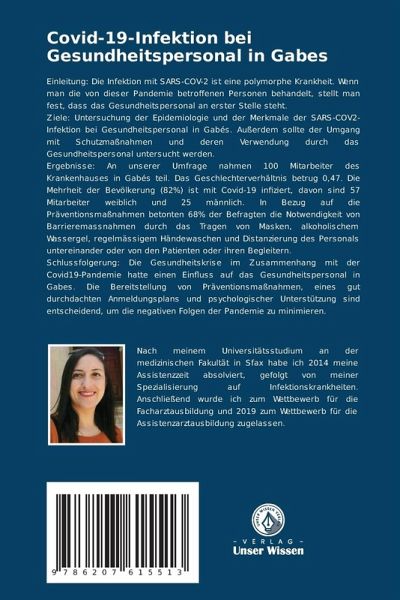 Einleitung: Die Infektion mit SARS-COV-2 ist eine polymorphe Krankheit. Wenn man die von dieser Pandemie betroffenen Personen behandelt, stellt man fest, dass das Gesundheitspersonal an erster Stelle steht.Ziele: Untersuchung der Epidemiologie und der Merkmale der SARS-COV2-Infektion bei Gesundheitspersonal in Gabés. Außerdem sollte der Umgang mit Schutzmaßnahmen und deren Verwendung durch das Gesundheitspersonal untersucht werden.Ergebnisse: An unserer Umfrage nahmen 100 Mitarbeiter des Krankenhauses in Gabés teil. Das Geschlechterverhältnis betrug 0,47. Die Mehrheit der Bevölkerung (82%) ist mit Covid-19 infiziert, davon sind 57 Mitarbeiter weiblich und 25 männlich. In Bezug auf die Präventionsmaßnahmen betonten 68% der Befragten die Notwendigkeit von Barrieremassnahmen durch das Tragen von Masken, alkoholischem Wassergel, regelmässigem Händewaschen und Distanzierung des Personals untereinander oder von den Patienten oder ihren Begleitern.Schlussfolgerung: Die Gesundheitskrise im Zusammenhang mit der Covid19-Pandemie hatte einen Einfluss auf das Gesundheitspersonal in Gabes. Die Bereitstellung von Präventionsmaßnahmen, eines gut durchdachten Anmeldungsplans und psychologischer Unterstützung sind entscheidend, um die negativen Folgen der Pandemie zu minimieren.