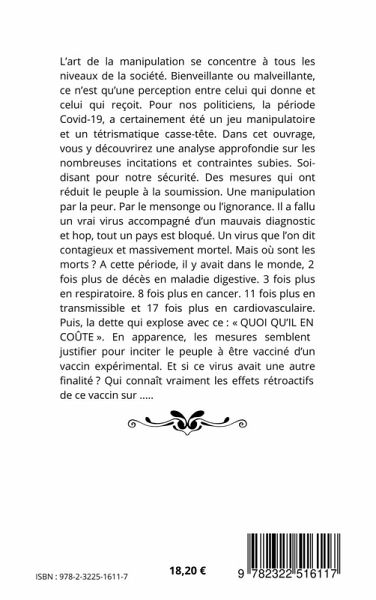 L'art de la manipulationse se concentre à tous les niveaux de la société. Bienveillante ou malveillante, ce n'est qu'une perception entre celui qui donne et celui qui reçoit. Pour nos politiciens, la période Cocid-19, a certainement été un jeu manipulatoire et un tétrismatique casse-tête. Dans cet ouvrage, vous y découvrirez une analyse approfondie sur les nombreuses incitations et contraintes subies. Soi-disant pour notre sécurité. Des mesures qui ont réduit le peuple à la soumission. Une manipulation par la peur. Par le mensonge ou l'ignorance. Il a fallu un vrai virus accompagné d'un mauvais diagnostique et hop, tout un pays est bloqué. Un virus que l'ont dit contagieux et massivement mortel. Mais où sont les morts? A cette période, il y avait dans le monde, 2 fois plus de décès en maladie digestive. 3 fois plus en respiratoire. 8 fois plus en cancer. 11 fois plus en transmissible et 17 fois plus en cardiovasculaire. Puis, la dette qui explose avec ce: "QUOI QU'IL EN COÛTE". En apparence, les mesures semblent justifier pour inciter le peuple à être vacciné d'un vaccin expérimental. Et si ce virus avait une autre finalité ? Qui connaît vraiment les effets rétroactifs de ce vaccin sur ..... Le Tome 2 de la Collection "Ne me croyez pas !" Cet ouvrage "Covid-19 La Manipulation Française" fait partie de la collection "Ne me croyez pas !". Du Tome 1 au Tome 4, chacun d'eux, est partaitement indépendant et complémentaire. Ensemble, ils forment une source complète de l'évolution de notre société. Cela vous permet d'élargir vos connaissances sur le sujet et de vous préparer à un avenir difficile. Tome 1/ Liberté, Surpopulation et Décadence 2020 / 2120. Tome 2/ Covid-19 La Manipulation Française. Tome 3/ Justice, l'Intérêt d'un Ordre Mondial. Tome 4/ Des Règles pour un Monde Meilleur. Je suis ravie de partager le fruit de mes recherches et analyses avec vous. Très bonne lecture à tous