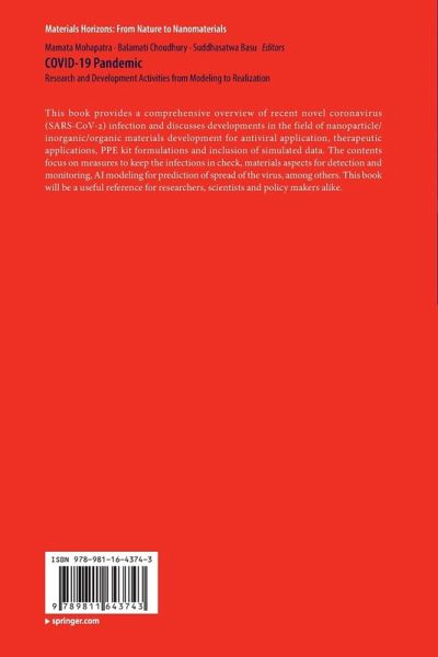 This book provides a comprehensive overview of recent novel coronavirus (SARS-CoV-2) infection and discusses developments in the field of nanoparticle/inorganic/organic materials development for antiviral application, therapeutic applications, PPE kit formulations and inclusion of simulated data. The contents focus on measures to keep the infections in check, materials aspects for detection and monitoring, AI modeling for prediction of spread of the virus, among others. This book will be a useful reference for researchers, scientists and policy makers alike.
