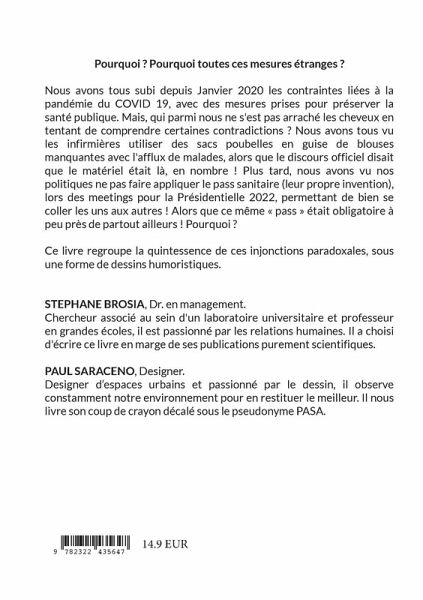Pourquoi ? Pourquoi toutes ces mesures étranges ?Nous avons tous subi depuis Janvier 2020 les contraintes liées à la pandémie du COVID 19, avec des mesures prises pour préserver la santé publique. Mais, qui parmi nous ne s'est pas arraché les cheveux en tentant de comprendre certaines contradictions ? Nous avons tous vu les infirmières utiliser des sacs poubelles en guise de blouses manquantes avec l'afflux de malades, alors que le discours officiel disait que le matériel était là en nombre ! Plus tard, nous avons vu nos politiques ne pas faire appliquer le pass sanitaire (leur propre invention), lors des meetings pour la Présidentielle 2022, permettant de bien se coller les uns aux autres ! Alors que ce même « pass » était obligatoire à peu près de partout ailleurs ! Pourquoi ?Ce livre regroupe la quintessence de ces injonctions paradoxales, sous une forme de dessins humoristiques.