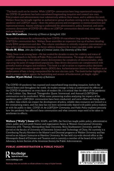 "This book could not be timelier. While LGBTQ+ communities have long experienced inequities, the COVID-19 pandemic has both exacerbated longstanding inequities and created new ones. Policymakers and administrators must substantively address these issues, and to address this need, Wallace Swan has brought together an authoritative group of authors writing on key topics linking the pandemic and LGBTQ+ equity-from the policy process and immigration to intersectionalities and representativeness. Anyone seeking to understand the administrative, policy, historical, and socio-economic dimensions of COVID-19's effects on LGBTQ+ communities should read, cite, assign, gift, and use this book." - Sean McCandless, University of Illinois at Springfield, USA