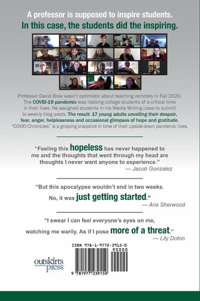 The COVID-19 pandemic has robbed college students of countless sacred, rite-of-passage experiences long taken for granted, a blow compounded by this country's political upheaval. "COVID Chronicles" started as a blog assignment in a Media Writing class and became a raw, gripping look at the impact of the pandemic on young adults - written in their own words as they navigated the all-online fall 2020 semester. Students shared heartfelt stories of fear, despair, anger - and - on occasion - hope. One struggled to see a way out of his depression. Another was afraid to leave her home and isolated herself from friends and family. One lived through a grandmother's COVID-19 diagnosis. And one, adopted from Korea as a baby, wrote about feeling staring, blaming eyes on her, as if she were somehow responsible for the virus. But there were uplifting posts too, including one student who was thankful for his isolated and safe mountaintop home and another who savored family time that otherwise wouldn't have happened. If you wonder how this pandemic is impacting our college students, "COVID Chronicles" will leave you wondering no more, and wanting to help them.