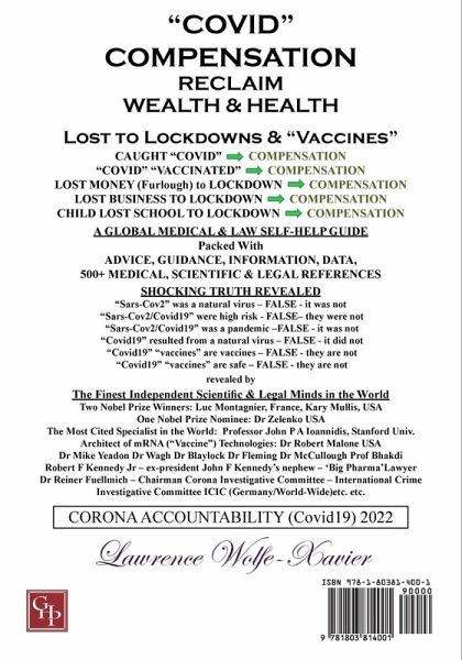 The world was quietly going about its "normal business" when late in 2019 the entire global world of 195 countries, even China, was turned completely on its head by a fake "virus" and a fake "pandemic". However, the world was not to know at the time, and for the most part still does not know; until the publication of this book, that the entire chapter and verse of the "virus" paradigm called "SarsCov2", and its ensuing ailment "Covid19 and its "pandemic" were all total lies and fake. Lies and fake propagated by hidden persons and their nominated puppets in mostly unelected, globalist organisations beyond the reach of sovereign states: WHO, WEF, UN, World Bank etc who in reality control the world. Consequently, in early 2020 and the following months through to 2021 there was a world-wide 'nightmare' that no one seemed to fully understand or indeed understand at all. This nightmare was known variously as "Coronavirus" "Sars-Cov2" and "Covid19". Coronaviruses can cause mild disease similar to a common cold. "Sars-Cov2" - severe acute respiratory syndrome coronavirus 2 was claimed to be a "novel" (new) coronavirus and the illness "Covid19", was supposedly caused by "Sars-Cov2". Mass Induced Dystopian Nightmare The dystopian nightmare had only just begun and was to last almost two full years - 2020-2022. Horrible images appeared from China (not the most democratic country in the world) then from Italy and other countries until world-wide. Preposterous projections of not to happen global deaths based on very flawed computer models were bandied about to an unknowing mass of a very frightened and unfortunately deliberately ill-informed global population. Global mass media fanned the flames morning, day, and night for many months on end. Inappropriate quarantine measures were globally, in lockstep, imposed that restricted human movement to an inhuman level that people were not permitted to see their loved ones when their loved ones were dying in hospitals and care homes! The world was a surreal, dystopian horror story - police vans patrolling the street at night, complete lockdown and no one allowed outside except for one hours walk per day, no gatherings greater than six, empty streets, closed and boarded shops, empty parks, and empty beaches. Draconian civil rights restrictions were imposed. The Global economic and social life the world over were about to fall into total collapse. On what data were these extreme measures taken? Was the world really under such a massive threat that we had to close down global capitalism for 2 years? Had the benefits of these very severe measures been adequately assessed against the damage that they would also no doubt cause to the global economy and to individual person's lives throughout the world? No, they had not. They were simply imposed globally without recourse to any open debate or serious risk analysis. Medico-Totalitarianism strode the world like a Great Dictator with all debate and opposition silenced by the baying mob of puppet Mainstream Media. Until the publication of this book - "COVID" COMPENSATION - SHOCKING TRUTH REVEALED by the finest independent scientific, medical, and legal minds in the world.