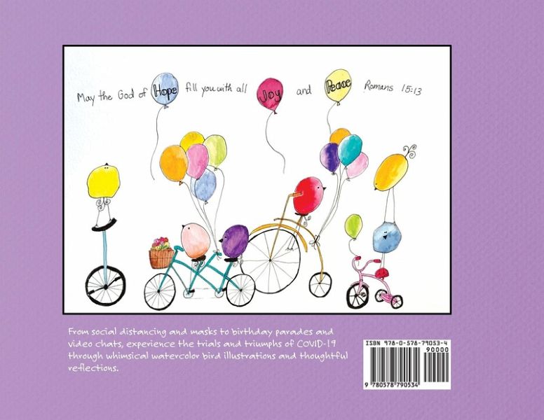 From social distancing and masks to birthday parades and video chats, experience the trials and triumphs of COVID-19 through whimsical watercolor bird illustrations and thoughtful reflections. From the introduction: This endeavor was born out of a gift card, a friend saying she thought I could learn to watercolor, online tutorials, and a global pandemic. Just like that, these little birds and I started telling the stories of Covid-19. The intention of this book is to bring levity to a horrific situation. It will be remembered as a time of loss for individuals, communities, families and so much more. Hopefully we will be able to remember some things with subtle joy.
