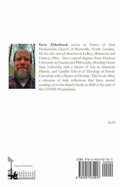 On Saturday, March 14, 2020, with COVID-19 begin to rage in this country, the Session of First Presbyterian Church and I decided we should heed the warnings about in-person activities and cancel Sunday worship for the next day. Little did any of us realize we would remain closed for in-person worship for next 11 months and likely for at least the next couple months ahead, even as people begin to receive the COVID vaccine. We felt we should always put people's health and safety before any other consideration. That Saturday, I sent out an email to our church family informing them about our decision. The following day, unable to preach my prepared sermon in worship, I decided to email my notes and reflections to the church family instead. Even though we began offering a virtual online Sunday worship service a couple weeks later, I continued to send out my daily email reflection and I have continued that practice every day since (except for vacation time) up until the present moment. That's well over 300 such daily reflections, and in that time I have ranged over topics related to the feast days of saints, historic events of that particular day in history, the writings of Thomas Merton (for many months I shared quotes from Merton on what I called "Merton Mondays"), poetry (as I ran out of quotes from Thomas Merton, Merton Mondays became "Poetry Mondays") and even some personal reflections on my life. The lectionary I use which provides the spark for these reflections is based on the Book of Common Worship and reflects the readings authorized by the Church of England for daily and weekly services. In this book you will find thirty selected daily reflections, most of them relating to the pandemic and our response to it as followers of Christ. Although these are specific reflections for a specific time, I certainly hope they have wider application and speak to the larger picture of how we can do our best to live as followers of Christ, pandemic or no pandemic. I also hope and pray that you, the reader, will find inspiration in these reflections, wherever you are along your journey of faith, as well. Thank you for reading, stay well, and may peace be with you!