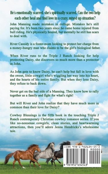 He's emotionally scarred, she's spiritually scarred. Can the two help each other heal and find love in a crazy, mixed up situation? John Manning made mistakes in college. Mistakes he's still paying for. It's been two years since he came home injured from bull riding. He's physically healed, but mentally he still has scars to deal with. River Cassidy is a foster-mom looking to protect her charge from a money-hungry man who claims to be the girl's biological father. When River runs to the Triple J Ranch looking for help protecting Daisy, she discovers so much more than a protector in John. As John gets to know Daisy, he can't help but fall in love with the sweet, little cowgirl who's wiggling her way into his heart, and the hearts of his entire family. But when they lose Daisy, they refuse to back down. Never get on the bad side of a Manning. They know how to rally together as a family and fight for what's right! But will River and John realize that they have much more in common than their love for Daisy? Cowboy Blessings is the fifth book in the touching Triple J Ranch contemporary Christian cowboy romance series. If you like no-nonsense cowgirls, clean stories, and heartwarming attractions, then you'll adore Jenna Hendricks's wholesome tale.