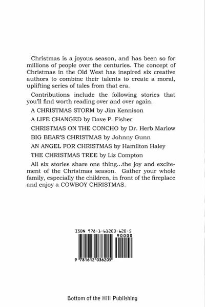 Christmas is a joyous season, and has been so for millions of people over the centuries. The concept of Christmas in the Old West has inspired six creative authors to combine their talents to create a moral, uplifting series of tales from that era. Contributions include the following stories that you'll find worth reading over and over again. A CHRISTMAS STORM by Jim Kennison - A LIFE CHANGED by Dave P. Fisher - CHRISTMAS ON THE CONCHO by Dr. Herb Marlow - BIG BEAR'S CHRISTMAS by Johnny Gunn - AN ANGEL FOR CHRISTMAS by Hamilton Haley - THE CHRISTMAS TREE by Liz Compton. All six stories share one thing...the joy and excitement of the Christmas season. Gather your whole family, especially the children, in front of the fireplace and enjoy a COWBOY CHRISTMAS.