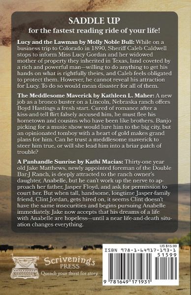 Saddle Up ... for the fastest reading ride of your life as three cowboys become cattlemen. Raised in the same small town in the Texas Hill Country because their mothers are sisters, three cousins, cowboys all, find God, the loves of their lives, and much, much more. This novella collection includes: Lucy and the Lawman by Molly Noble Bull: While on a business trip to Colorado in 1890, Sheriff Caleb Caldwell stops to inform Miss Lucy Gordan and her widowed mother of property they inherited in Texas, land coveted by a rich and powerful man-willing to do anything to get his hands on what is rightfully theirs, and Caleb feels obligated to protect them. However, he cannot reveal his attraction for Lucy. To do so would mean disaster for all of them. The Meddlesome Maverick by Kathleen L. Maher: A new job as a bronco buster on a Lincoln, Nebraska ranch offers Boyd Hastings a fresh start. Cured of romance after a kiss-and-tell flirt falsely accused him, he must flee his hometown and cousins who have been like brothers. Banjo picking for a music show would lure him to the big city, but an opinionated tomboy with a heart of gold makes grand plans for him. Can he trust a meddlesome maverick to steer him true, or will she lead him into a briar patch of trouble? A Panhandle Sunrise by Kathi Macias: Thirty-one year old Jake Matthews, newly appointed foreman of the Double Bar-J Ranch, is deeply attracted to the ranch owner's daughter, Anabelle, but he can't work up the nerve to approach her father, Jasper Floyd, and ask for permission to court her. But when tall, handsome, longtime Jasper-family friend, Clint Jordan, gets hired on, it seems Clint doesn't have the same insecurities and begins pursuing Anabelle immediately. Jake now accepts that his dreams of a life with Anabelle are hopeless-until a near life-and-death situation changes everything.
