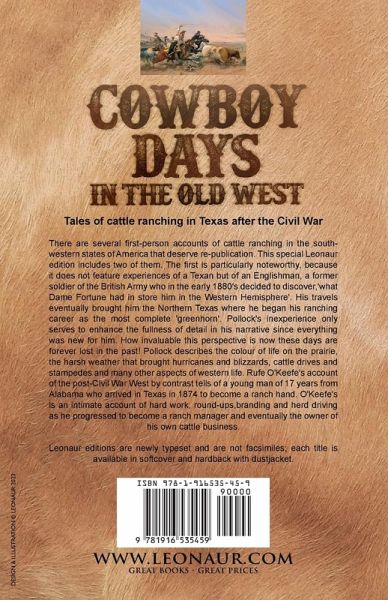 Tales of cattle ranching in Texas after the Civil War There are several first-person accounts of cattle ranching in the south-western states of America that deserve re-publication. This special Leonaur edition includes two of them. The first is particularly noteworthy, because it does not feature experiences of a Texan but of an Englishman, a former soldier of the British Army who in the early 1880's decided to discover,'what Dame Fortune had in store him in the Western Hemisphere'. His travels eventually brought him the Northern Texas where he began his ranching career as the most complete 'greenhorn'. Pollock's inexperience only serves to enhance the fullness of detail in his narrative since everything was new for him. How invaluable this perspective is now these days are forever lost in the past! Pollock describes the colour of life on the prairie, the harsh weather that brought hurricanes and blizzards, cattle drives and stampedes and many other aspects of western life. Rufe O'Keefe's account of the post-Civil War West by contrast tells of a young man of 17 years from Alabama who arrived in Texas in 1874 to become a ranch hand. O'Keefe's is an intimate account of hard work, round-ups,branding and herd driving as he progressed to become a ranch manager and eventually the owner of his own cattle business.