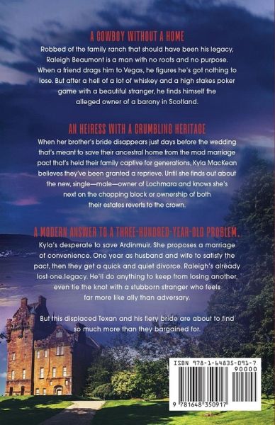 A cowboy without a home Robbed of the family ranch that should have been his legacy, Raleigh Beaumont is a man with no roots and no purpose. When a friend drags him to Vegas, he figures he's got nothing to lose. But after a hell of a lot of whiskey and a high stakes poker game with a beautiful stranger, he finds himself the alleged owner of a barony in Scotland. An heiress with a crumbling heritage When her brother's bride disappears just days before the wedding that's meant to save their ancestral home from the mad marriage pact that's held their family captive for generations, Kyla MacKean believes they've been granted a reprieve. Until she finds out about the new, single-male-owner of Lochmara and knows she's next on the chopping block or ownership of both their estates reverts to the crown. A modern answer to a three-hundred-year-old problem. Raleigh's lost his land once. He's not about to lose it again. Not even because of some lunatic pact made centuries before he was born. Kyla's desperate to save Ardinmuir. She agrees to marry him on one condition: They wed for one year to satisfy the pact, then get a quick and quiet divorce. There's no stipulation against it, and they'll both get what they want. But this displaced Texan and his fiery bride are about to find so much more than they bargained for.