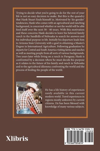 Trying to decide what you're going to do for the rest of your life is not an easy decision to make. But this is the quandry that Hank Stuart finds himself in. Motivated by 'do-gooder' tendencies, Hank who comes with an agricultural and ranching background, is concerned whether or not the world will be able feed itself over the next 30 - 40 years. With this motivation and these concerns Hank decides to leave his beloved family ranch in the Sandhills of Nebraska to search for answers and his individual purpose in life. Initially his departure leads him to Arizona State University with a goal in obtaining a Master's Degree in International Agriculture. Following graduation he departs for Central and South America visiting farms and ranches as well as meeting people from all sorts of various backgrounds. Two years later while living on a ranch in Paraguay, Hank is confronted by a decision where he must decide his purpose as it relates to the future of his family and ranch in Nebraska and to the agricultural dilemma confronting the world and the process of feeding the people of the world.