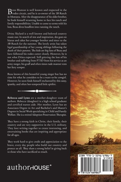 Beau Blanton is well known and respected in the rodeo circuit, and he is co-owner of the 3B Ranch in Montana. After the disappearance of his older brother, he finds himself returning home to face his ranch and family responsibilities. Unable to come to terms with his loss, Beau dives headfirst into running the ranch. Drina Skylard is a well known and beloved country music star. In search of rest and inspiration, she goes on hiatus and takes her younger brother and sister to the 3B Ranch for the summer. The lovely artist has taken legal guardianship of her young siblings following the death of their parents. The kids are big fans of Beau and have followed his rodeo career closely. However, he is not what Drina expected. Still grieving the loss of his brother and suffering from PTSD from his service as an army ranger, his gruff and often times rude manner tests her fiery temper. Beau knows of this beautiful young singer but has no time for what he considers to be a want-to-be cowgirl. However, he soon finds himself enchanted by this sassy, spunky, and often hot-tempered little spitfire.