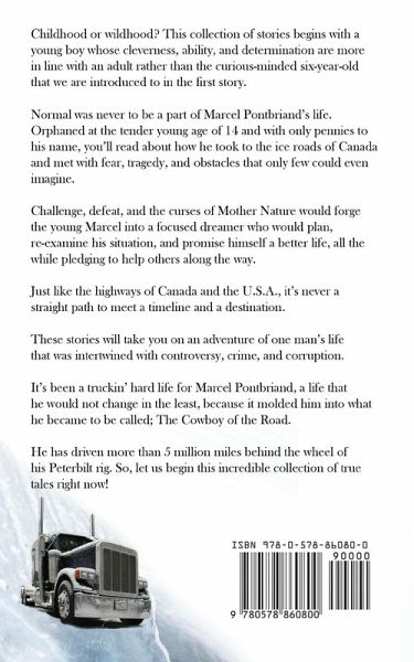 Childhood or wildhood? This collection of stories begins with a young boy whose cleverness, ability, and determination are more in line with an adult rather than the curious-minded six-year-old that we are introduced to in the first story. Normal was never to be a part of Marcel Pontbriand's life. Orphaned at the tender young age of 14 and with only pennies to his name, you'll read about how he took to the ice roads of Canada and met with fear, tragedy, and obstacles that only few could even imagine. Challenge, defeat, and the curses of Mother Nature would forge the young Marcel into a focused dreamer who would plan, re-examine his situation, and promise himself a better life, all the while pledging to help others along the way. Just like the highways of Canada and the U.S.A., it's never a straight path to meet a timeline and a destination.These stories will take you on an adventure of one man's life that was intertwined with controversy, crime, and corruption.It's been a truckin' hard life for Marcel Pontbriand, a life that he would not change in the least, because it molded him into what he became to be called; Cowboy of the Road He has driven more than 5 million miles behind the wheel of his Peterbilt rig. So, let us begin this incredible collection of true tales right now! Stories about life and death, corruption and life problems. This book is one of the best memoirs of all time and relates to a young ice road trucker who has overcome so many hurdles. Please enjoy one of the best biography.