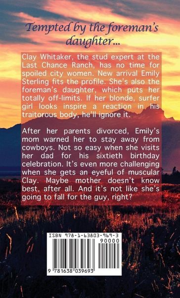 Tempted by the foreman's daughter... Clay Whitaker, the stud expert at the Last Chance Ranch, has no time for spoiled city women. New arrival Emily Sterling fits the profile. She's also the foreman's daughter, which puts her totally off-limits. If her blonde, surfer girl looks inspire a reaction in his traitorous body, he'll ignore it. After her parents divorced, Emily's mom warned her to stay away from cowboys. Not so easy when she visits her dad for his sixtieth birthday celebration. It's even more challenging when she gets an eyeful of muscular Clay. Maybe mother doesn't know best, after…mehr