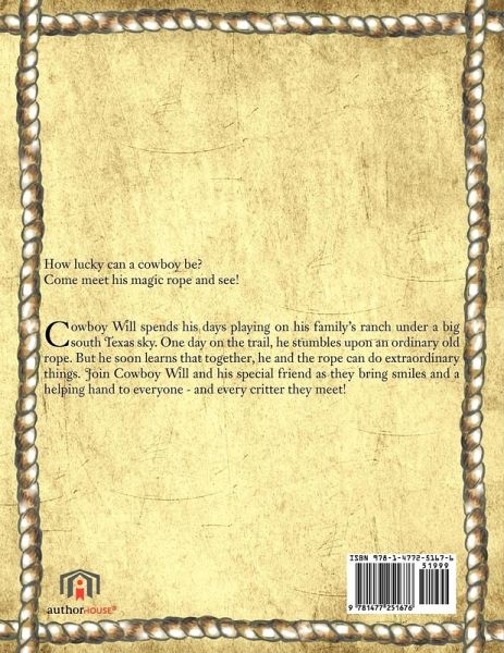 How lucky can a cowboy be? Come meet his magic rope and see! Cowboy Will spends his days playing on his family's ranch under a big south Texas sky. One day on the trail, he stumbles upon an ordinary old rope. But he soon learns that together, he and the rope can do extraordinary things. Join Cowboy Will and his special friend as they bring smiles and a helping hand to everyone - and every critter they meet!