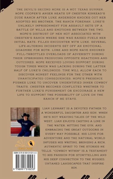 THE DEVIL'S SECOND HOME IS A HOT TEXAS SUMMER. HOPE COOPER'S ANGER HEATS UP CHESTER KINKEAD'S DUDE RANCH AFTER LUKE ANDERSON KNOCKS OUT HER ADOPTED BIG BROTHER. THE RANCH FOREMAN. LUKE'S UNLIKELY IMPRISONMENT FOR ASSAULT SETS UP A BATTLE OF WILLS AND EMOTIONS BETWEEN THE TWO. HOPE'S DISTRUST OF MEN NOT ASSOCIATED WITH CHESTER'S RANCH WHERE SHE WAS RAISED FUELS HER INITIAL HATE- FILLED ENCOUNTER WITH LUKE. SEVERAL LIFE-ALTERING INCIDENTS SET OFF AN EMOTIONAL OUAGMIRE FOR BOTH. LUKE AND HOPE HAVE ENDURED FULL-THROTTLED OVERLOADS OF ADVERSITY DURING THEIR UPBRINGING PRODUCING OPPOSITE REACTIONS AND OUTCOMES. HOPE RECEIVED LOVING SUPPORT DURING TOUGH TIMES WHICH WAS LACKING DURING THE LATTER HALF OF LUKE'S CHILDHOOD. TIME WILL ALLOW EACH TO DISCOVER HONEST FEELINGS FOR THE OTHER WITH UNANTICIPATED CONSEQUENCES. HOPE'S PRESENCE PUSHES LUKE TO UNCOVER UNIDENTIFIED INNER COWBOY TRAITS. CHESTER BECOMES CONFLICTED WHETHER TO FURTHER LUKE'S PUNISHMENT OR ENCOURAGE A NEW LIFE TO SUPPORT THE POSSIBILITY OF LOVE ON THE RANCH IF HE STAYS.