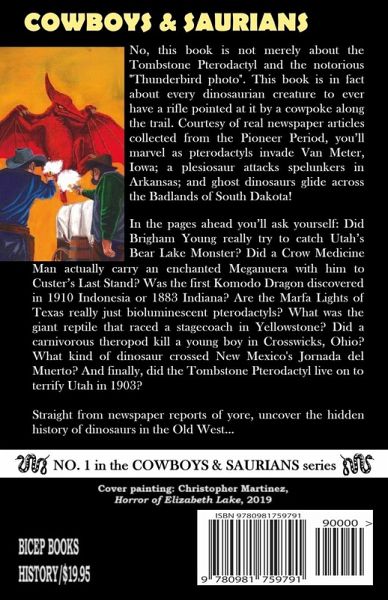 No, this book is not merely about the Tombstone Pterodactyl and the notorious "Thunderbird photo". This book is in fact about every dinosaurian creature to ever have a rifle pointed at it by a cowpoke along the trail. Courtesy of real newspaper articles collected from the Pioneer Period, you'll marvel as pterodactyls invade Van Meter, Iowa; a plesiosaur attacks spelunkers in Arkansas; and ghost dinosaurs glide across the Badlands of South Dakota! In the pages ahead you'll ask yourself: Did Brigham Young really try to catch Utah's Bear Lake Monster? Did a Crow Medicine Man actually carry an enchanted Meganuera with him to Custer's Last Stand? Was the first Komodo Dragon discovered in 1910 Indonesia or 1883 Indiana? Are the Marfa Lights of Texas really just bioluminescent pterodactyls? What was the giant reptile that raced a stagecoach in Yellowstone? Did a carnivorous theropod kill a young boy in Crosswicks, Ohio? What kind of dinosaur crossed New Mexico's Jornada del Muerto? And finally, did the Tombstone Pterodactyl live on to terrify Utah in 1903? Straight from newspaper reports of yore, uncover the hidden history of dinosaurs in the Old West…