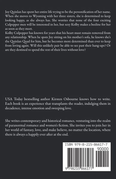 Joy Quinlan has spent her entire life trying to be the personification of her name. When she moves to Wyoming with her three sisters, she is determined to keep looking happy, as she always has. She worries that none of the four exciting Culpepper men will be interested in her, but sexy Kolby makes a beeline for her as soon as they meet. Kolby Culpepper has known for years that his heart must remain removed from any relationship. When he spots Joy sitting on his mother's sofa, he knows she's the Quinlan Quad for him, but he becomes more determined than ever to keep from loving again. Will this unlikely pair be able to see past their hang-ups? Or are they destined to spend the rest of their lives without love?