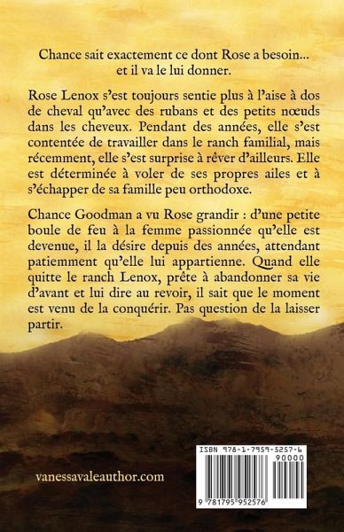 Chance sait exactement ce dont Rose a besoin... et il va le lui donner. Rose Lenox s'est toujours sentie plus à l'aise à dos de cheval qu'avec des rubans et des petits n¿uds dans les cheveux. Pendant des années, elle s'est contentée de travailler dans le ranch familial, mais récemment, elle s'est surprise à rêver d'ailleurs. Elle est déterminée à voler de ses propres ailes et à s'échapper de sa famille peu orthodoxe. Chance Goodman a vu Rose grandir : d'une petite boule de feu à la femme passionnée qu'elle est devenue, il la désire depuis des années, attendant patiemment qu'elle lui appartienne. Quand elle quitte le ranch Lenox, prête à abandonner sa vie d'avant et lui dire au revoir, il sait que le moment est venu de la conquérir. Pas question de la laisser partir.