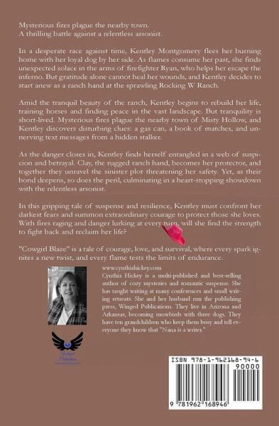 Mysterious fires plague the nearby town. A thrilling battle against a relentless arsonist. In a desperate race against time, Kentley Montgomery flees her burning home with her loyal dog by her side. As flames consume her past, she finds unexpected solace in the arms of firefighter Ryan, who helps her escape the inferno. But gratitude alone cannot heal her wounds, and Kentley decides to start anew as a ranch hand at the sprawling Rocking W Ranch. Amid the tranquil beauty of the ranch, Kentley begins to rebuild her life, training horses and finding peace in the vast landscape. But tranquility is short-lived. Mysterious fires plague the nearby town of Misty Hollow, and Kentley discovers disturbing clues: a gas can, a book of matches, and unnerving text messages from a hidden stalker. As the danger closes in, Kentley finds herself entangled in a web of suspicion and betrayal. Clay, the rugged ranch hand, becomes her protector, and together they unravel the sinister plot threatening her safety. Yet, as their bond deepens, so does the peril, culminating in a heart-stopping showdown with the relentless arsonist. In this gripping tale of suspense and resilience, Kentley must confront her darkest fears and summon extraordinary courage to protect those she loves. With fires raging and danger lurking at every turn, will she find the strength to fight back and reclaim her life? "Cowgirl Blaze" is a tale of courage, love, and survival, where every spark ignites a new twist, and every flame tests the limits of endurance.