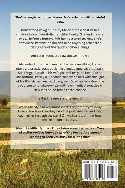 She's a cowgirl with trust issues. He's a doctor with a painful past. Headstrong cowgirl Charity Miller is the eldest of five children in a million-dollar ranching family. She had dreams, once... before a betrayal left her heartbroken. Now she's convinced herself she doesn't need anything other than taking care of the ranch and her siblings. Until she meets the new doctor in town. Alejandro Lumis has been told he has everything. Looks, money, a prestigious position in a hectic medical practice in San Diego. But after his wife passed away, he feels like he has nothing, barely alive other than when he's with the light of his life, his ten-year-old daughter. So when he's given the opportunity to take over a small-town medical practice in New Mexico, he leaps at the chance. Is this the new start he needs? When Charity and Alejandro meet, they both try to deny their attraction. Can they face the past head-on and help each other through the pain? Or will fear stop them from another chance at love...