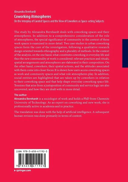 The study by Alexandra Bernhardt deals with coworking spaces and their atmospheres. In addition to a comprehensive consideration of the role of atmospheres, the special significance of community in the context of these work spaces is examined in more detail. Two case studies in urban coworking spaces form the core of the investigation, following a qualitative research design oriented towards ethnography and a plurality of methods. In the context of the analysis, on the one hand, what constitutes coworking in everyday life and thus the new communality at work is considered: relevant practices and rituals, spatial arrangements and atmospheres are elaborated in their composition. On the other hand, coworkers, their spatial actions, and the attitudes associated with them come into closer focus: It is shown how users access coworking spaces as work and community spaces and what role atmospheres play. In addition, social entities are highlighted that are taken up by coworkers in relationto their coworking space and that help shape everyday coworking space life. Tensions that arise from the coexistence of community and service logic are also uncovered, and how they are dealt with is examined in more detail.
