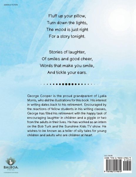 George Cooper is the proud grandparent of Lydia Morris, who did the illustrations for this book. His interest in writing dates back to his retirement. Encouraged by the reactions of fellow students in his writing classes, George has filled his retirement with the happy task of encouraging laughter in children and a giggle or two from the adults in their lives. He has worked as an intern on the Bob Turk and the Sunshine Kids TV show. He wishes to be known as a teller of silly tales for young children and adults who are children at heart.
