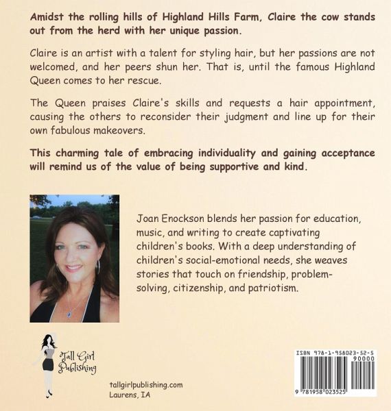 Amidst the rolling hills of Highland Hills Farm, Claire the cow stands out from the herd with her unique passion. Claire is an artist with a talent for styling hair, but her passions are not welcomed and her peers shun her. That is until the famous Highland Queen comes to her rescue. The Queen praises Claire's skills and requests a hair appointment, causing the others to reconsider their judgment and line up for their fabulous makeovers. This charming tale of embracing individuality and gaining acceptance will remind us of the value of being supportive and kind. Perfect for ages 3-8, children will want to read about Claire's journey from the negativity of being different to the joy of acceptance. Tall Girl Publishing books are appropriate for any classroom, public or private library, and home.