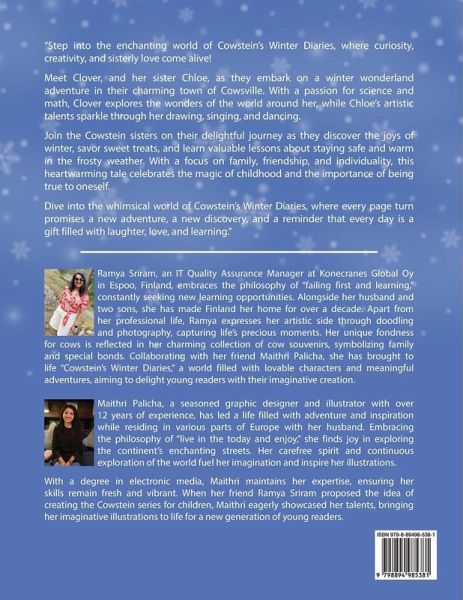 "Step into the enchanting world of Cowstein's Winter Diaries, where curiosity, creativity, and sisterly love come alive! Meet Clover, and her talented sister Chloe, as they embark on a winter wonderland adventure in their charming town of Cowsville. With a passion for science and math, Clover explores the wonders of the world around her, while Chloe's artistic talents sparkle through her drawing, singing, and dancing. Join the Cowstein sisters on their delightful journey as they discover the joys of winter, savor sweet treats, and learn valuable lessons about staying safe and warm in the frosty weather. With a focus on family, friendship, and individuality, this heartwarming tale celebrates the magic of childhood and the importance of being true to oneself. Dive into the whimsical world of Cowstein's Winter Diaries, where every page turn promises a new adventure, a new discovery, and a reminder that every day is a gift filled with laughter, love, and learning."