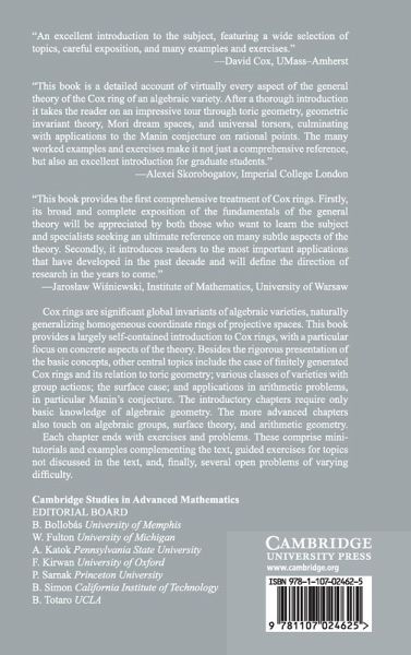 Cox rings are significant global invariants of algebraic varieties, naturally generalizing homogeneous coordinate rings of projective spaces. This book provides a largely self-contained introduction to Cox rings, with a particular focus on concrete aspects of the theory. Besides the rigorous presentation of the basic concepts, other central topics include the case of finitely generated Cox rings and its relation to toric geometry; various classes of varieties with group actions; the surface case; and applications in arithmetic problems, in particular Manin's conjecture. The introductory chapters require only basic knowledge in algebraic geometry. The more advanced chapters also touch on algebraic groups, surface theory, and arithmetic geometry. Each chapter ends with exercises and problems. These comprise mini-tutorials and examples complementing the text, guided exercises for topics not discussed in the text, and, finally, several open problems of varying difficulty.
