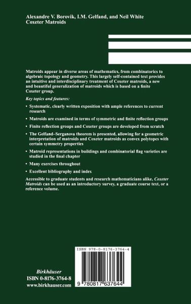 From the reviews: "This largely self-contained text provides an intuitive and interdisciplinary treatment of Coxeter matroids, a new and beautiful generalization of matroids which is based on a finite Coxeter group." - ZENTRALBLATT MATH "...this accessible and well-written book, intended to be "a cross between a postgraduate text and a research monograph," is well worth reading and makes a good case for doing matroids with mirrors." - SIAM REVIEW "This accessible and well-written book, intended to be 'a cross between a postgraduate text and a research monograph,' is well worth reading and makes a good case for doing matroids with mirrors." (Joseph Kung, SIAM Review, Vol. 46 (3), 2004) "This accessible and well-written book, designed to be 'a cross between a postgraduate text and a research monograph', should win many converts."(MATHEMATICAL REVIEWS)