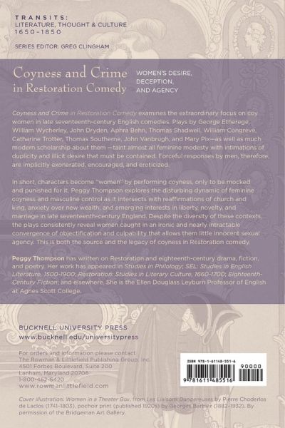 Coyness and Crime in Restoration Comedy examines the extraordinary focus on coy women in late seventeenth-century English comedy. Plays by Etherege, Wycherley, Dryden, Behn, Shadwell, Congreve, Trotter, Southerne, Vanbrugh, and Pix-as well as much modern scholarship about them-taint almost all feminine modesty with intimations of duplicity and illicit desire that must be contained. Forceful responses by men, therefore, are implicitly exonerated, encouraged, and eroticized. In short, characters become "women" by performing coyness, only to be mocked and punished for it. Peggy Thompson explores the disturbing dynamic of feminine coyness and masculine control as it interacts with reaffirmations of church and king, anxiety over new wealth, and emerging interests in liberty, novelty, and marriage in late seventeenth-century England. Despite the diversity of these contexts, the plays consistently reveal women caught in an ironic and nearly intractable convergence of objectification and culpability that allows them little innocent sexual agency. This is both the source and the legacy of coyness in Restoration comedy.