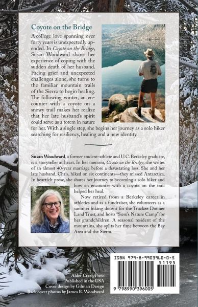 A college love spanning over forty years is unexpectedly upended. In Coyote on the Bridge, a memoir, Susan Woodward shares her experience of coping with the sudden death of her husband. Facing grief and unexpected challenges alone, she turns to familiar mountain trails of the Sierra to begin healing. The following winter, an encounter with a coyote on a snowy trail makes her realize that her late husband's spirit could serve as a totem in nature for her. Inspired by the majesty of the coyote on the bridge, and the intense moment they stare each other down, she regains her confidence. With a single step, she begins her journey as a solo hiker searching for resiliency, healing and a new identity in the mountains.