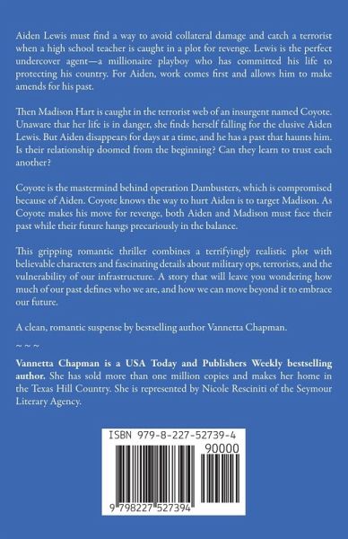 Aiden Lewis must find a way to avoid collateral damage and catch a terrorist when a high school teacher is caught in a plot for revenge. Lewis is the perfect undercover agent-a millionaire playboy who has committed his life to protecting his country. For Aiden, work comes first and allows him to make amends for his past. Then Madison Hart is caught in the terrorist web of an insurgent named Coyote. Unaware that her life is in danger, she finds herself falling for the elusive Aiden Lewis. But Aiden disappears for days at a time, and he has a past that haunts him. Is their relationship doomed from the beginning? Can they learn to trust each another? Coyote is the mastermind behind operation Dambusters, which is compromised because of Aiden. Coyote knows the way to hurt Aiden is to target Madison. As Coyote makes his move for revenge, both Aiden and Madison must face their past while their future hangs precariously in the balance. This gripping romantic thriller combines a terrifyingly realistic plot with believable characters and fascinating details about military ops, terrorists, and the vulnerability of our infrastructure. A story that will leave you wondering how much of our past defines who we are, and how we can move beyond it to embrace our future. A clean, romantic suspense by bestselling author Vannetta Chapman What critics say about Vannetta Chapman What Critics Say About Vannetta Chapman --"The intense roller-coaster of a plot and sharply etched characters will appeal to readers ~Library Journal --"a great addition to the world of romantic suspense!" ~Suspense Sisters Reviews What Readers Say About Vannetta Chapman's Coyote's Revenge: ***** 'I could not find a stopping point in the plot.' ***** 'Coyote's Revenge will keep you gnawing on your fingernails until the explosive end.' ***** 'Another page turner, thrills, chills and suspense.' ***** 'You won't be able to leave it until the last page is turned' ***** 'Defending American was a good title and theme for this story' ***** 'A great read. Danger, secrets and love.' ***** 'As usual she nailed it.'