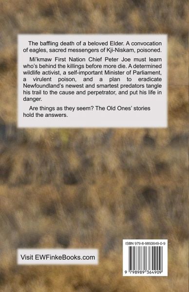 The baffling death of a beloved Elder. A convocation of eagles, sacred messengers of Kji-Niskam, poisoned. Mi'kmaw First Nation Chief Peter Joe must learn who's behind the killings before more die. A determined wildlife activist, a self-important Minister of Parliament, a virulent poison, and a plan to eradicate Newfoundland's newest and smartest predators tangle his trail to the cause and perpetrator, and put his life in danger. Are things as they seem? The Old Ones' stories hold the answers.