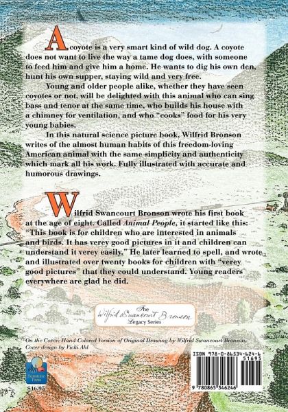 A coyote is a very smart kind of wild dog. A coyote does not want to live the way a tame dog does, with someone to feed him and give him a home. He wants to dig his own den, hunt his own supper, staying wild and very free. Young and older people alike, whether they have seen coyotes or not, will be delighted with this animal who can sing bass and tenor at the same time, who builds his house with a chimney for ventilation, and who "cooks" food for his very young babies. In this natural science picture book, Wilfrid Bronson writes of the almost human habits of this freedom-loving American animal with the same simplicity and authenticity which mark all his work. Fully illustrated with accurate and humorous drawings. Wilfred Swancourt Bronson wrote his first book at the age of eight. Called "Animal People," it started like this: "This book is for children who are interested in animals and birds. It has verey good pictures in it and children can understand it verey easily." He later learned to spell, and wrote and illustrated over twenty books for children with "verey good pictures" that they could understand. Young readers everywhere are glad he did.